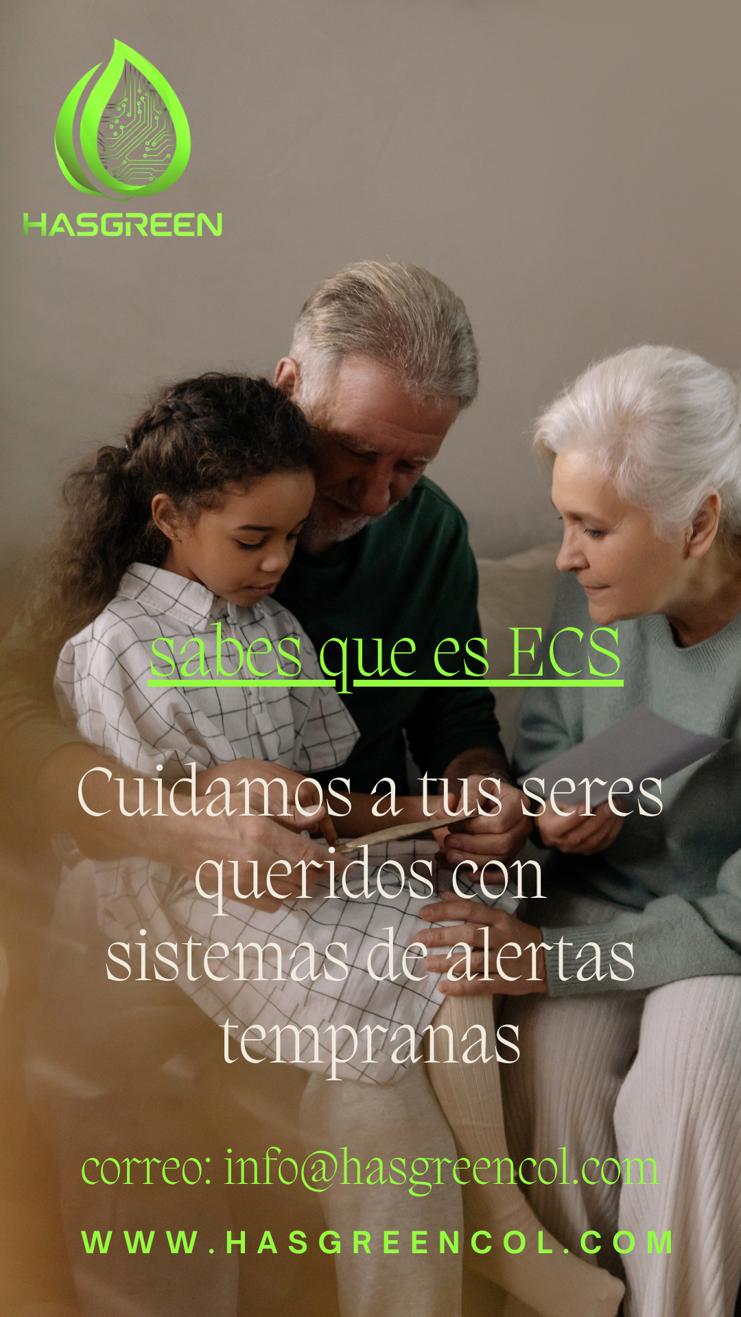 Normalmente cuando una persona se encuentra en alguna situación de pánico ocasionado por una fuerte caída, dolor en el pecho, dificultad para respirar etc., a esa persona se le dificulta tratar de llamar por teléfono y solo si lo tiene cerca podrá tratar de hacerlo, perdiendo tiempo valioso que le podría salvar la vida. con nuestro sistema solo debe presionar un botón de pánico que estará estratégicamente ubicado o simplemente lo puede llevar como un pendiente o un reloj. Una vez presionado Hasgreen se encarga de notificar de manera inmediata a familiares y personas que deban recibir esa notificación y de esta manera se pueda recibir la atención requerida lo mas pronto posible.